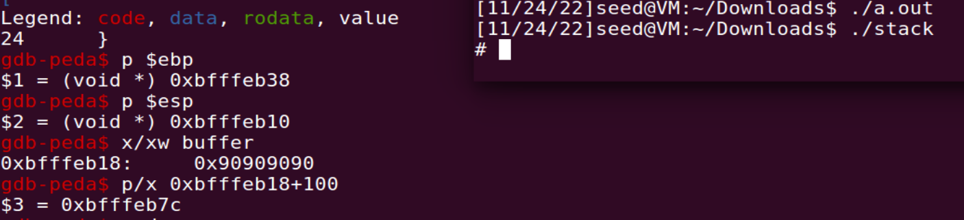 p/d $ebp-0xffffcf84=32,也即是说,ebp在buffer上面32字节的位置- 返回地址为buffer上面36字节的位置