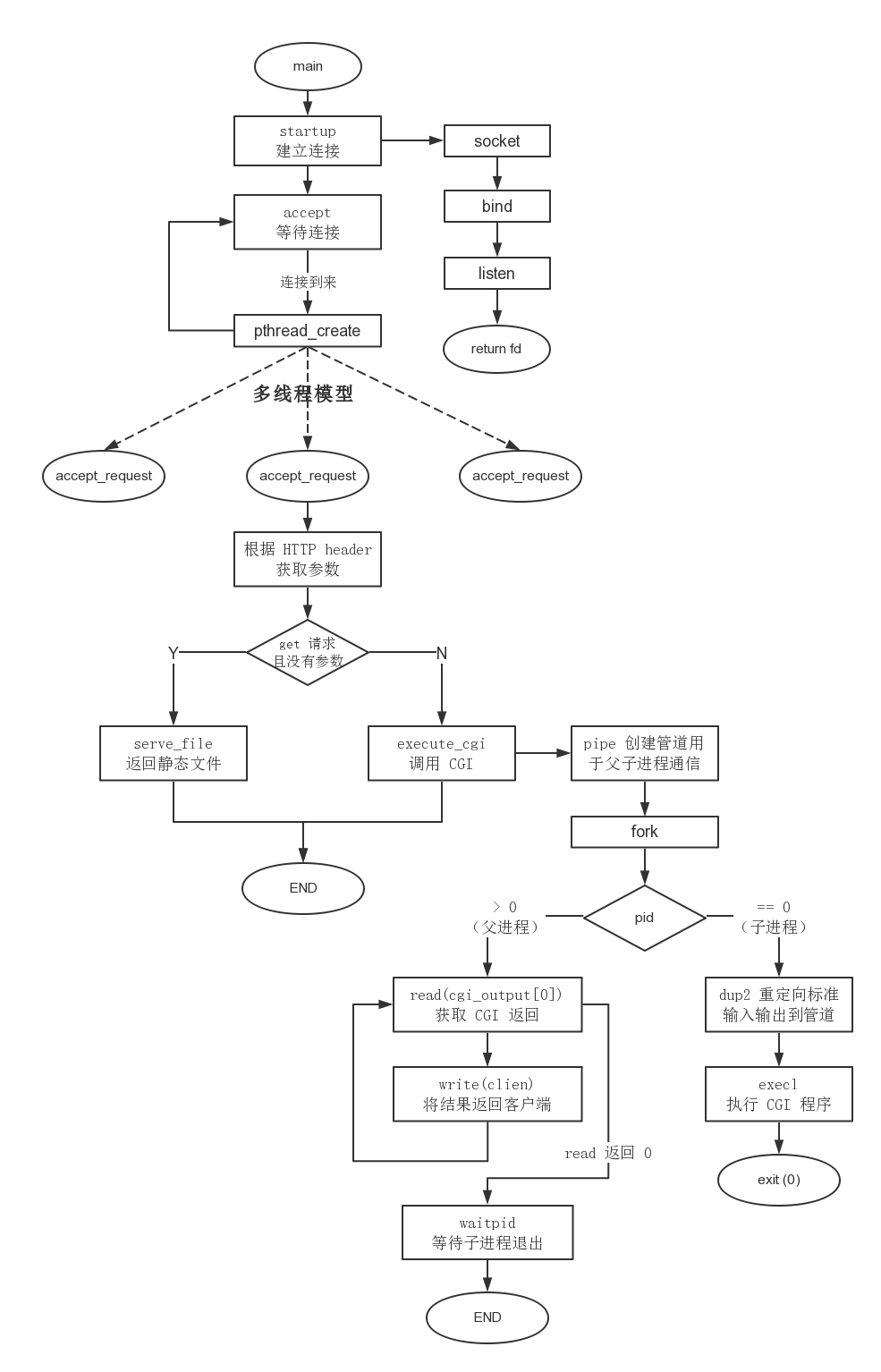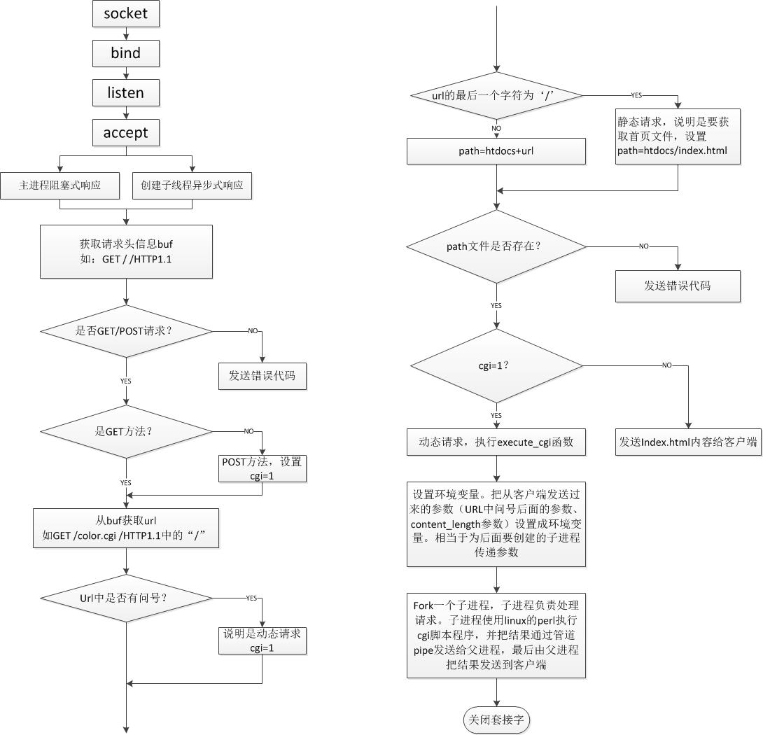- accept_request函数判断http请求是post还是get,从而决定是直接向client传送文件还是执行cgi脚本