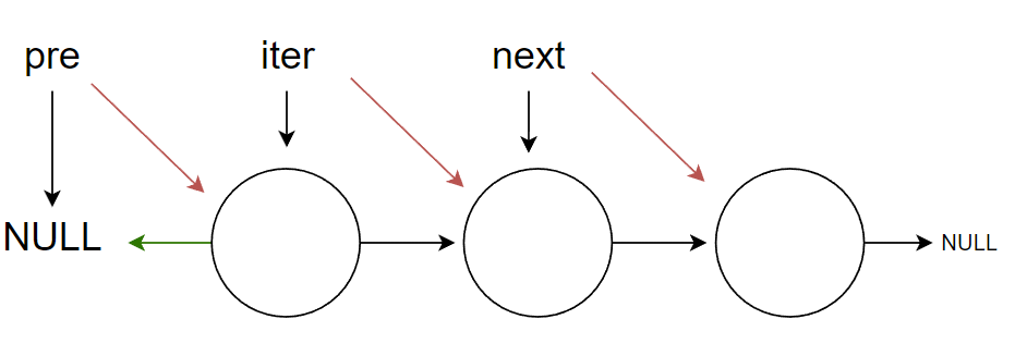- 使用三个指针,pre指针和iter指针用来改变节点的指向,next指针一直往后移动且试探是否下一个节点为null